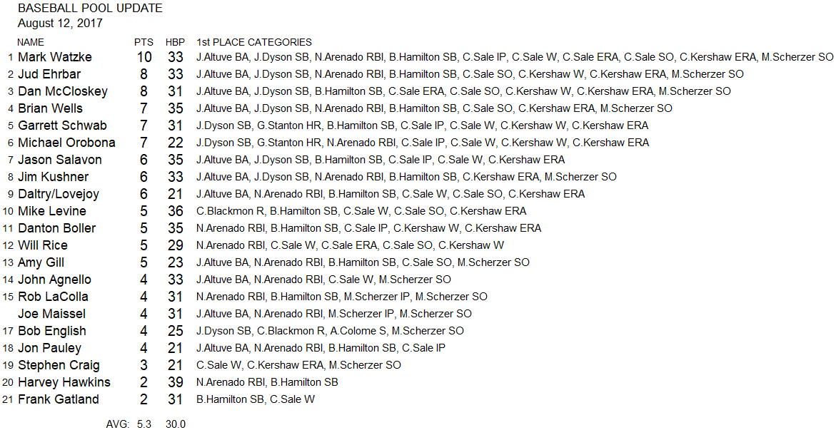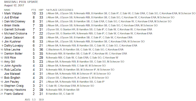 The rest of us might focus on two categories for any hope of catching our longtime leader: AL wins and NL saves. Chris Sale is currently tied at 14 wins with the Royals' Jason Vargas; Sale slipping out of first would bring eleven entrants one point closer to Mark. In the NL, the red-hot Dodgers have pushed Kenley Jansen to within two saves of Greg Holland for the league lead. Watzke is one of just eight entrants to choose a closer other than Jansen for the category...